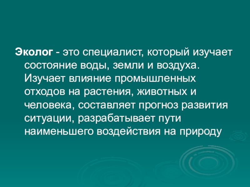 Эколог - это специалист, который изучает состояние воды, земли и воздуха.