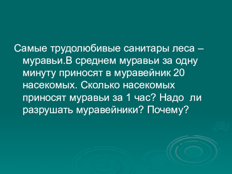 Самые трудолюбивые санитары леса – муравьи.В среднем муравьи за одну минуту приносят в муравейник 20 насекомых. Сколько
