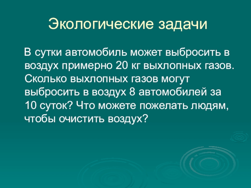 Экологические задачи  В сутки автомобиль может выбросить в воздух примерно 20 кг выхлопных газов. Сколько выхлопных