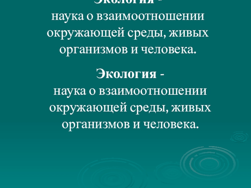 Экология - наука о взаимоотношении окружающей среды, живых организмов и человека.Экология - наука о взаимоотношении окружающей среды, живых организмов