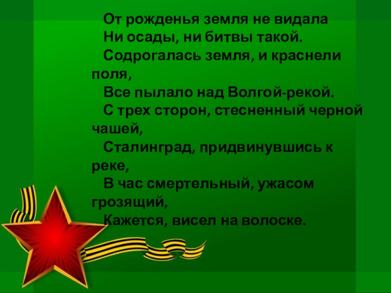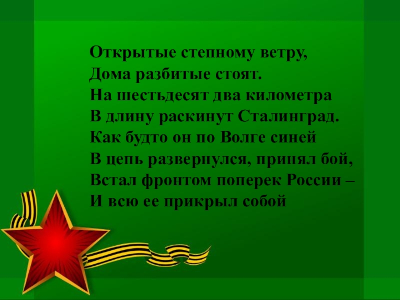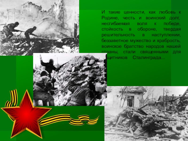 несгибаемая воля к победе, стойкость в обороне, твердая решительность в наступлении, беззаветное мужество и храбрость, воинское братство народов нашей страны, стали священными для защитников Сталинграда...