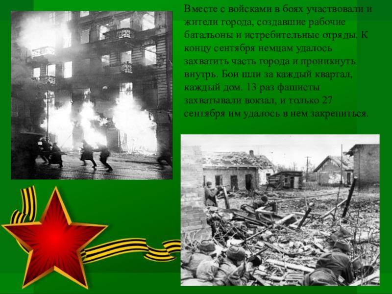 батальоны и истребительные отряды. К концу сентября немцам удалось захватить часть города и проникнуть внутрь. Бои шли за каждый квартал, каждый дом. 13 раз фашисты захватывали вокзал, и только 27 сентября им удалось в нем закрепиться.