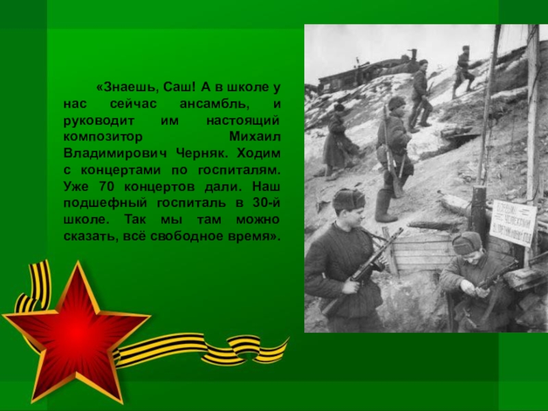 сейчас ансамбль, и руководит им настоящий композитор Михаил Владимирович Черняк. Ходим с концертами по госпиталям. Уже 70 концертов дали. Наш подшефный госпиталь в 30-й школе. Так мы там можно сказать, всё свободное время».