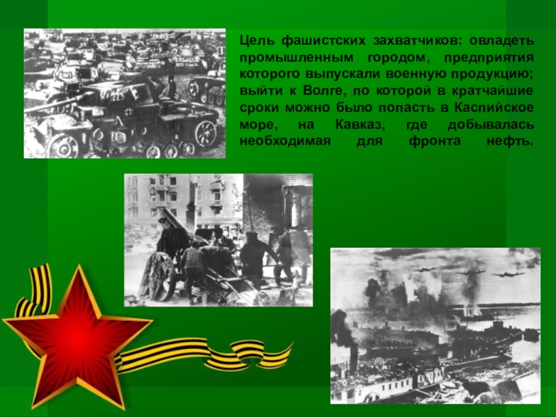 Слайд 5Цель фашистских захватчиков: овладеть промышленным городом, предприятия которого выпускали военную продукцию;