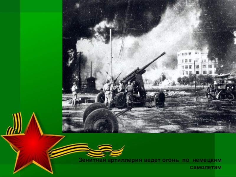 Слайд 16Зенитная артиллерия ведет огонь по немецким самолетам