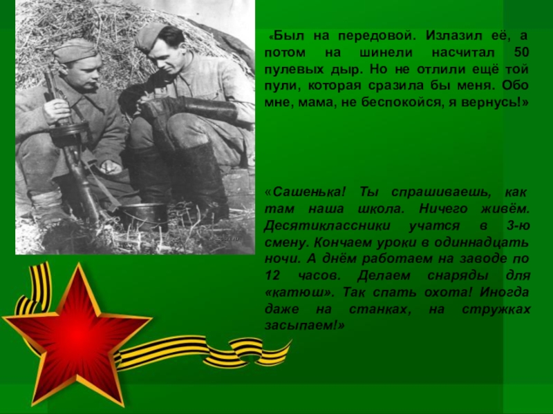 «Сашенька! Ты спрашиваешь, как там наша школа. Ничего живём. Десятиклассники учатся в 3-ю смену. Кончаем уроки в одиннадцать ночи. А днём работаем на заводе по 12 часов. Делаем снаряды для «катюш». Так спать охота! Иногда даже на станках, на стружках засыпаем!»