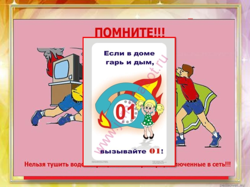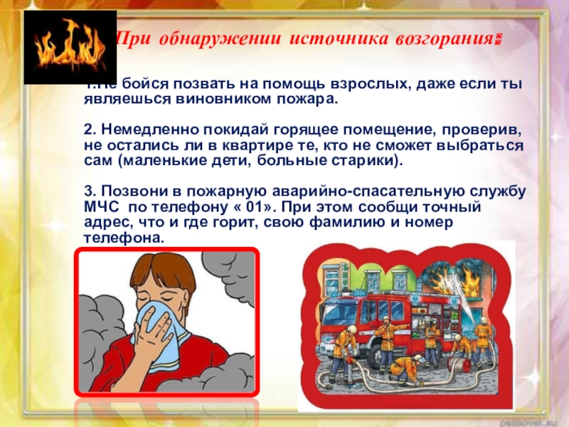 3. Позвони в пожарную аварийно-спасательную службу МЧС по телефону « 01». При этом сообщи точный адрес, что и где горит, свою фамилию и номер телефона.