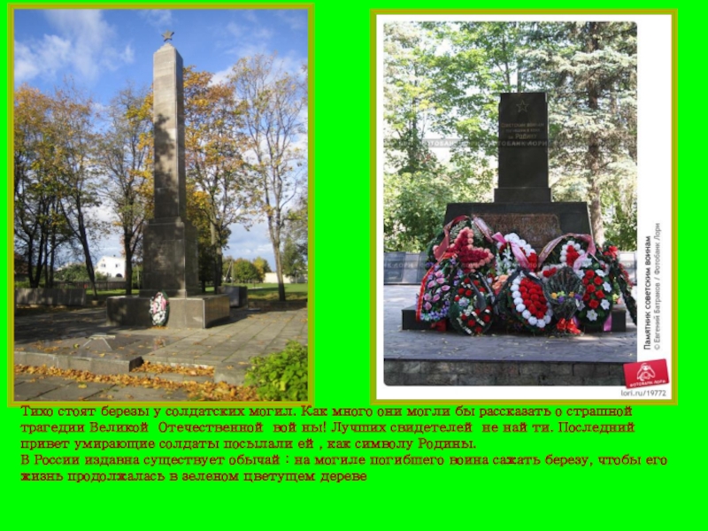 Слайд 12Тихо стоят березы у солдатских могил. Как много они могли бы