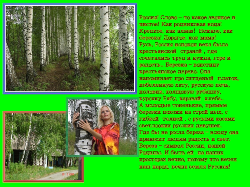 Где бы не росла береза – всюду она приносит людям радость и свет. Береза – символ России, нашей Родины. И быть ей на наших просторах вечно, потому что вечен наш народ, вечна земля Русская!
