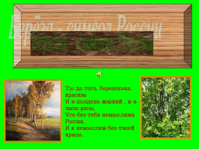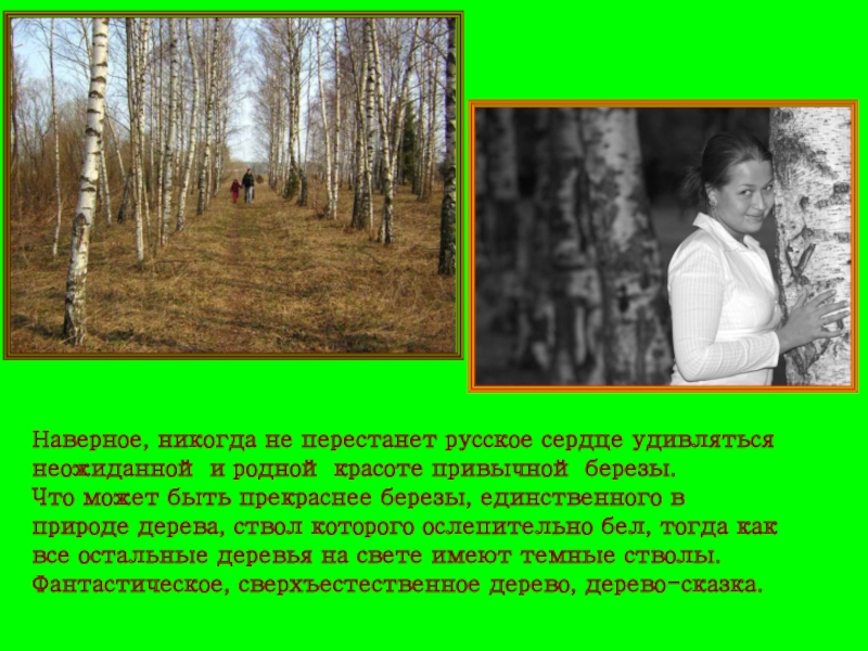 что представляется при слове «Россия». Для русского человека нет дерева роднее и любимее, чем эта белоствольная красавица. . Известно, что ни в какой стране нет такого обилия берез, как у нас. Со времен глухой старины вошли в нашу жизнь стройные и тихие березки. Мила она русскому сердцу.