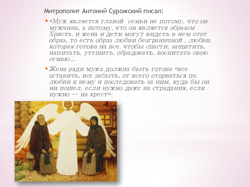 Митрополит Антоний Сурожский писал: «Муж является гла­вой семьи не потому, что он мужчина, а потому, что он
