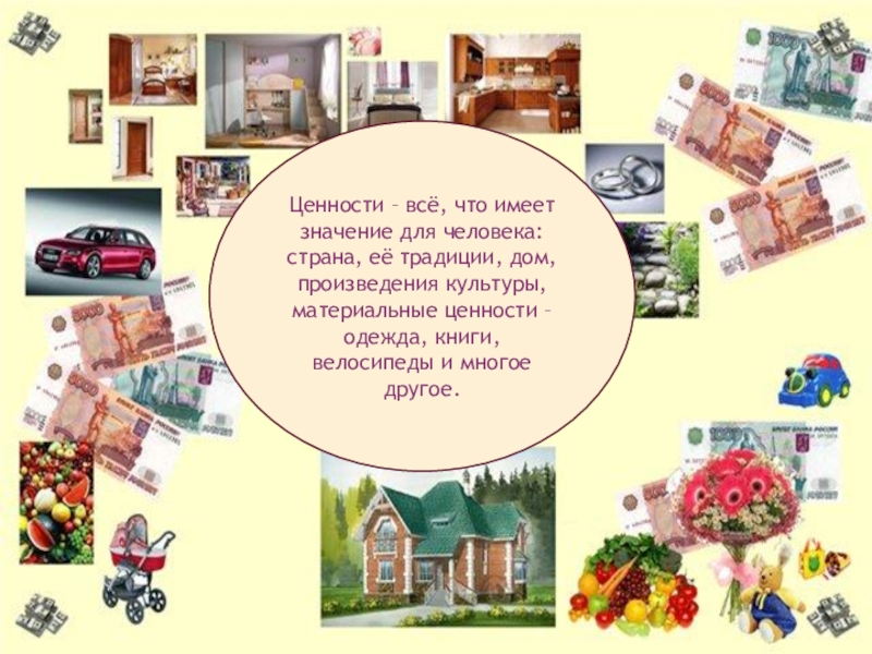 Ценности – всё, что имеет значение для человека: страна, её традиции, дом, произведения культуры, материальные ценности –