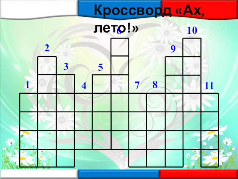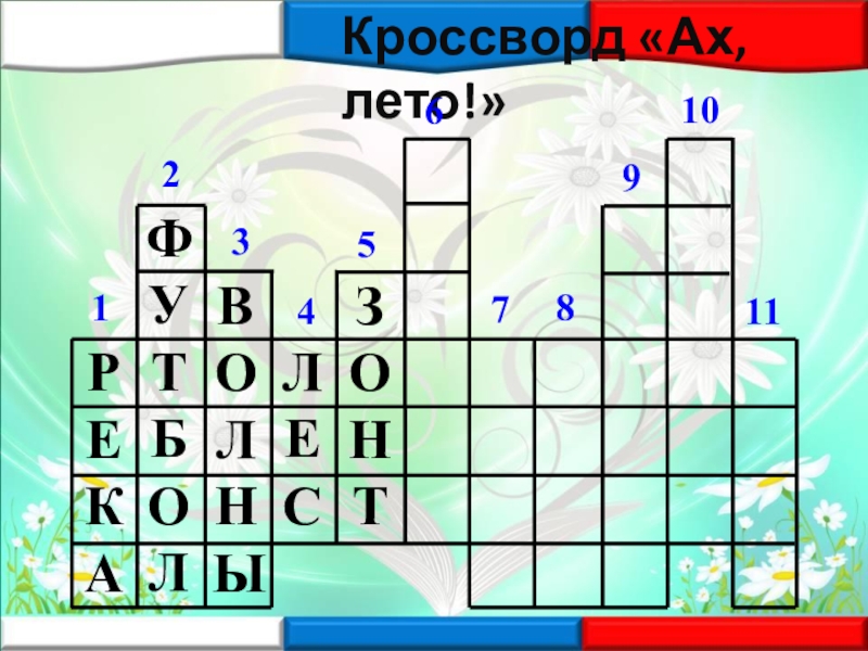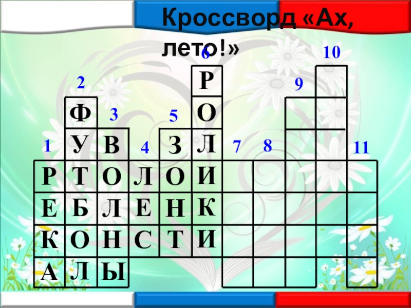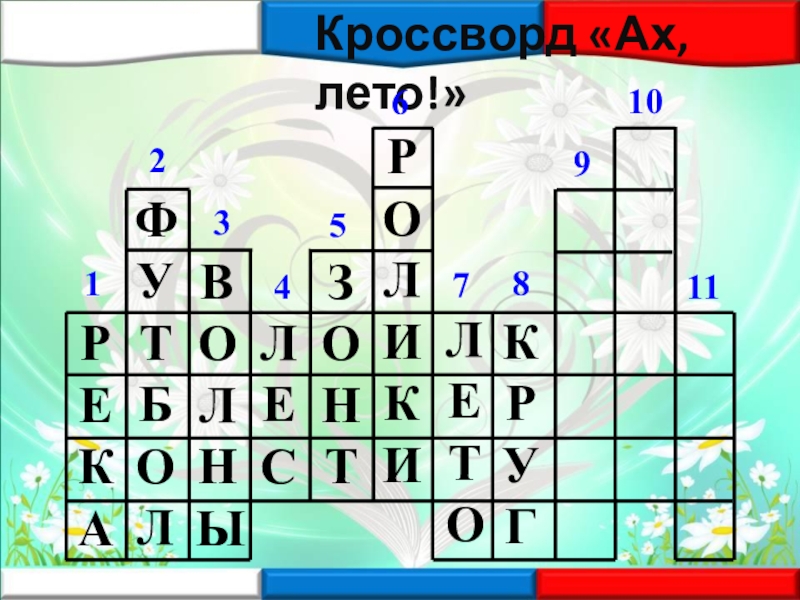Кроссворд «Ах, лето!»1234567891011РЕКАФУТБОЛВОЛНЫЛЕСЗОНТРОЛИКИКРУГЛЕТОСОЛНЦЕ