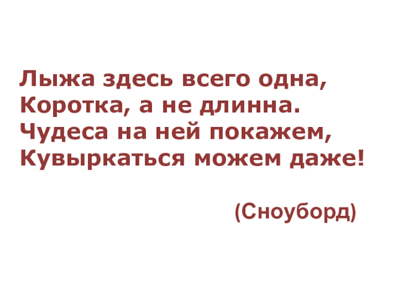 Лыжа здесь всего одна,Коротка, а не длинна.Чудеса на ней покажем,Кувыркаться можем даже!