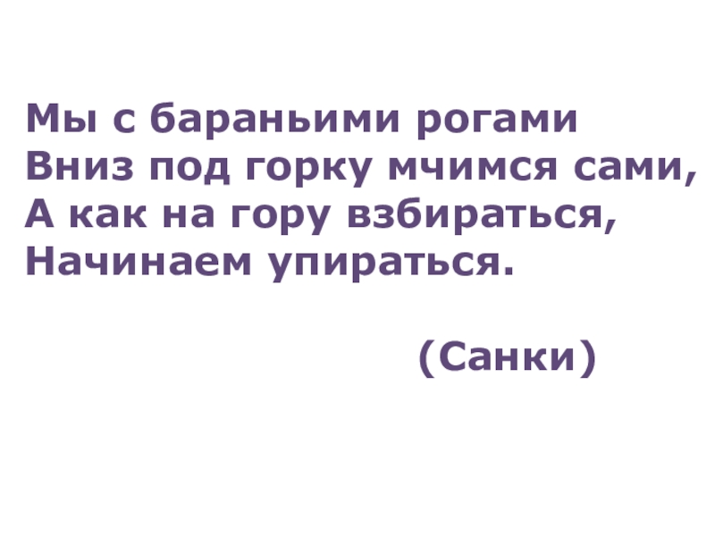 Мы с бараньими рогамиВниз под горку мчимся сами,А как на гору взбираться,Начинаем упираться.