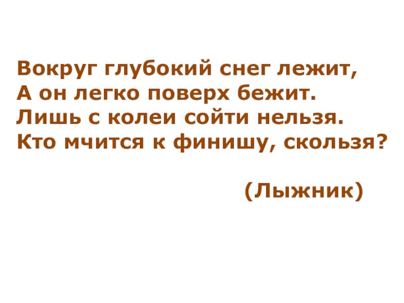 Вокруг глубокий снег лежит,А он легко поверх бежит.Лишь с колеи сойти нельзя.Кто мчится к финишу, скользя?