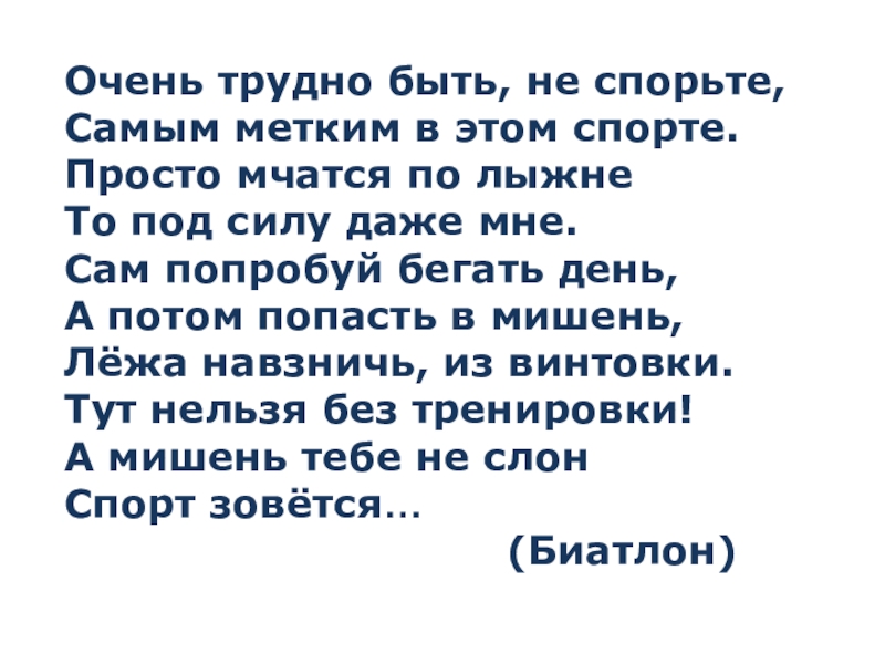 Очень трудно быть, не спорьте,Самым метким в этом спорте.Просто мчатся по лыжнеТо под силу даже мне.Сам попробуй
