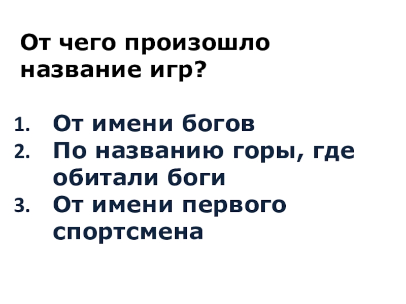 От чего произошло название игр?От имени боговПо названию горы, где обитали богиОт имени первого спортсмена