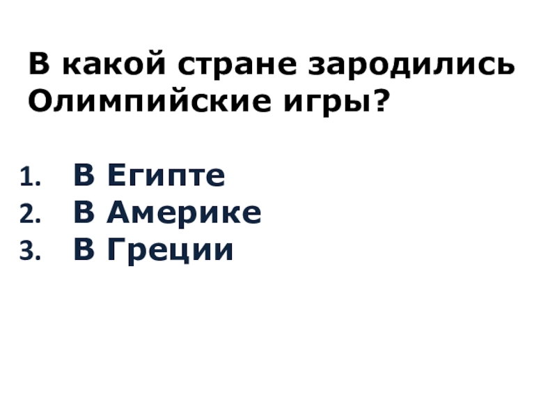 В какой стране зародились Олимпийские игры?В ЕгиптеВ АмерикеВ Греции