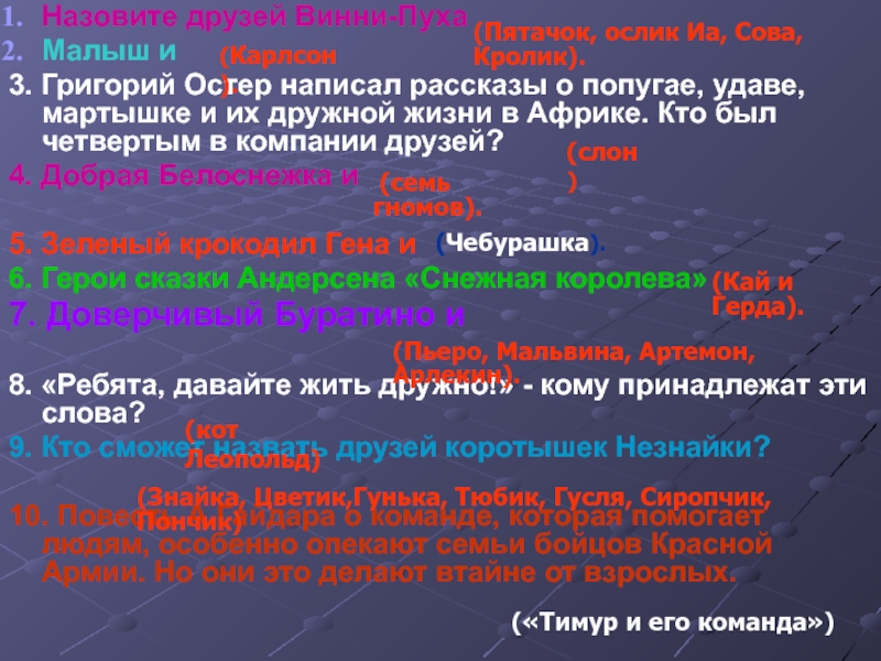 (Знайка, Цветик,Гунька, Тюбик, Гусля, Сиропчик, Пончик)