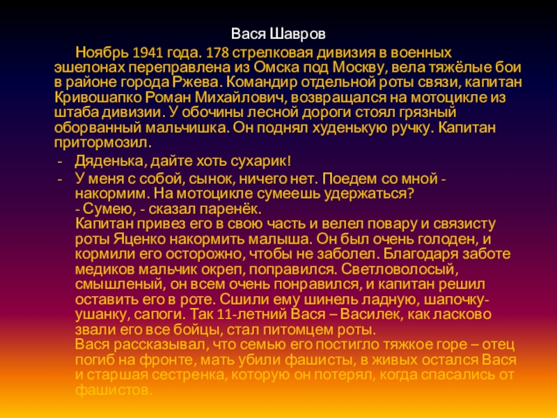 из Омска под Москву, вела тяжёлые бои в районе города Ржева. Командир отдельной роты связи, капитан Кривошапко Роман Михайлович, возвращался на мотоцикле из штаба дивизии. У обочины лесной дороги стоял грязный оборванный мальчишка. Он поднял худенькую ручку. Капитан притормозил.