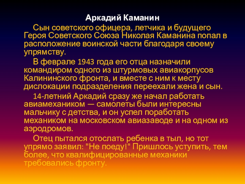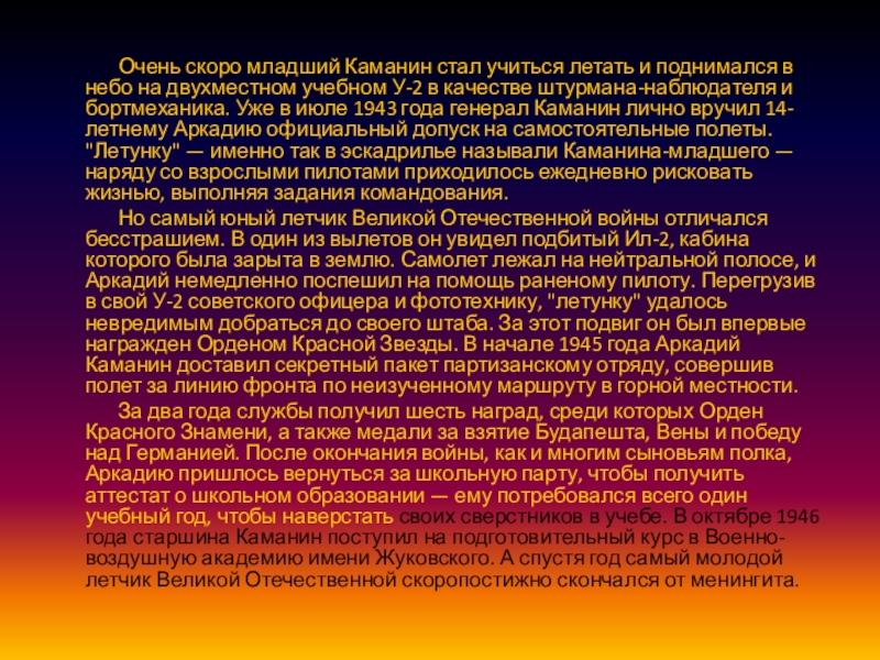 на двухместном учебном У-2 в качестве штурмана-наблюдателя и бортмеханика. Уже в июле 1943 года генерал Каманин лично вручил 14-летнему Аркадию официальный допуск на самостоятельные полеты. "Летунку" — именно так в эскадрилье называли Каманина-младшего — наряду со взрослыми пилотами приходилось ежедневно рисковать жизнью, выполняя задания командования.