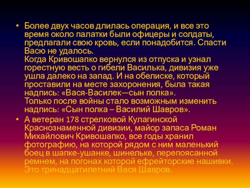 А ветеран 178 стрелковой Кулагинской Краснознаменной дивизии, майор запаса Роман Михайлович Кривошапко, все годы хранил фотографию, на которой рядом с ним маленький боец в шапке-ушанке, шинельке, перепоясанной ремнем, на погонах которой ефрейторские нашивки. Это тринадцатилетний Вася Шавров.