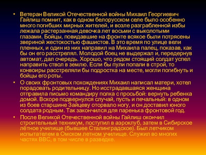 Слайд 20Ветеран Великой Отечественной войны Михаил Георгиевич Гайлиш помнит, как в одном