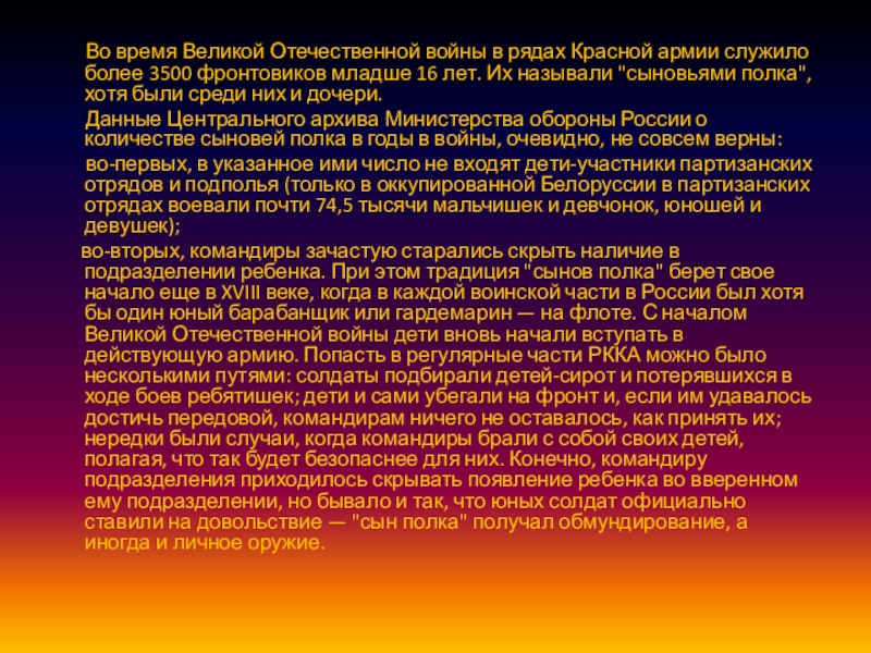 во-вторых, командиры зачастую старались скрыть наличие в подразделении ребенка. При этом традиция "сынов полка" берет свое начало еще в XVIII веке, когда в каждой воинской части в России был хотя бы один юный барабанщик или гардемарин — на флоте. С началом Великой Отечественной войны дети вновь начали вступать в действующую армию. Попасть в регулярные части РККА можно было несколькими путями: солдаты подбирали детей-сирот и потерявшихся в ходе боев ребятишек; дети и сами убегали на фронт и, если им удавалось достичь передовой, командирам ничего не оставалось, как принять их; нередки были случаи, когда командиры брали с собой своих детей, полагая, что так будет безопаснее для них. Конечно, командиру подразделения приходилось скрывать появление ребенка во вверенном ему подразделении, но бывало и так, что юных солдат официально ставили на довольствие — "сын полка" получал обмундирование, а иногда и личное оружие.