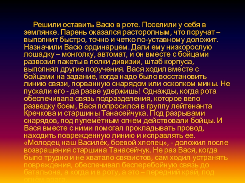 оказался расторопным, что поручат – выполнит быстро, точно и четко по-уставному доложит. Назначили Васю ординарцем. Дали ему низкорослую лошадку – монголку, автомат, и он вместе с бойцами развозил пакеты в полки дивизии, штаб корпуса, выполнял другие поручения. Вася ходил вместе с бойцами на задание, когда надо было восстановить линию связи, порванную снарядом или осколком мины. Не пускали его - да разве удержишь! Однажды, когда рота обеспечивала связь подразделения, которое вело разведку боем, Вася попросился в группу лейтенанта Кречкова и старшины Танасейчука. Под разрывами снарядов, под пулемётным огнем действовали бойцы. И Вася вместе с ними помогал прокладывать провод, находить поврежденную линию и исправлять ее. «Молодец наш Василёк, боевой хлопец», - доложил после возвращения старшина Танасейчук. Не раз Вася, когда было трудно и не хватало связистов, сам ходил устранять повреждения, обеспечивал бесперебойную связь до батальона, а когда и в роту, а это – передний край, под огнём врага.