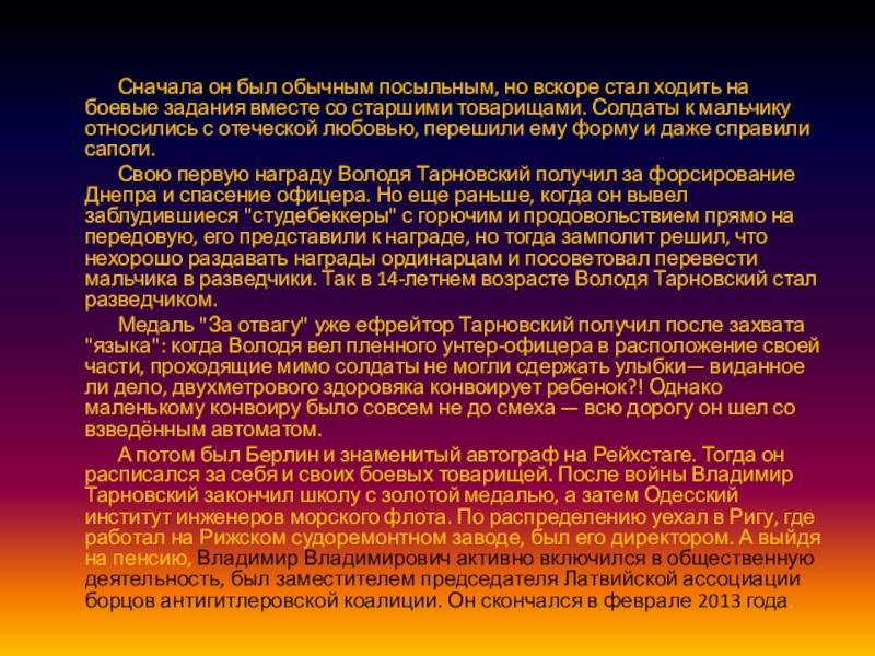 Свою первую награду Володя Тарновский получил за форсирование Днепра и спасение офицера. Но еще раньше, когда он вывел заблудившиеся "студебеккеры" с горючим и продовольствием прямо на передовую, его представили к награде, но тогда замполит решил, что нехорошо раздавать награды ординарцам и посоветовал перевести мальчика в разведчики. Так в 14-летнем возрасте Володя Тарновский стал разведчиком.