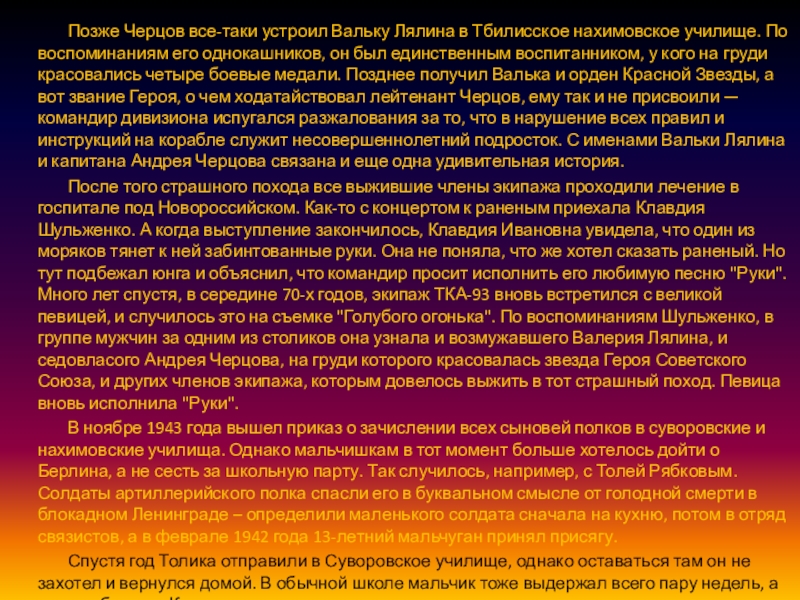 Слайд 16Позже Черцов все-таки устроил Вальку Лялина в Тбилисское нахимовское училище. По