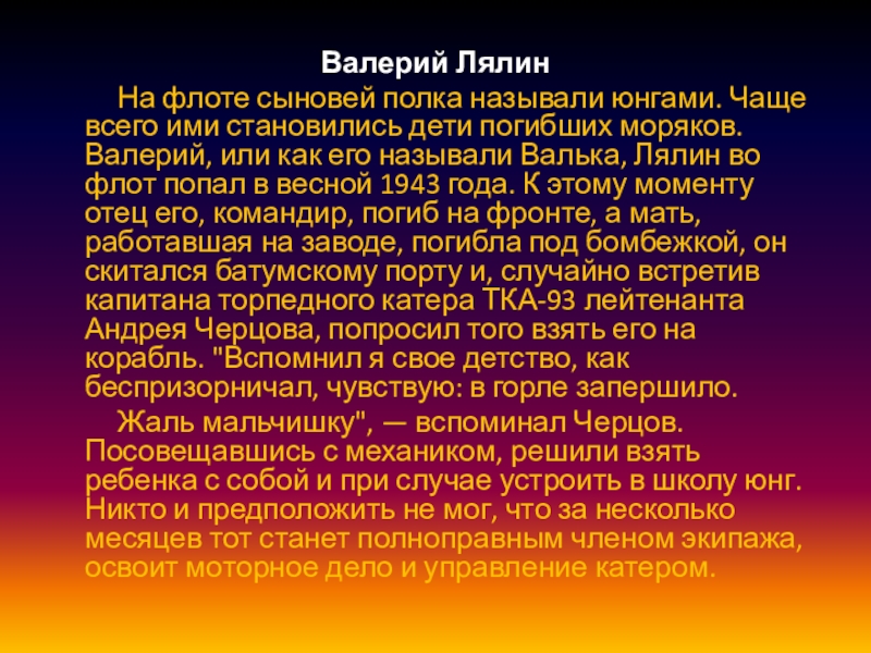 дети погибших моряков. Валерий, или как его называли Валька, Лялин во флот попал в весной 1943 года. К этому моменту отец его, командир, погиб на фронте, а мать, работавшая на заводе, погибла под бомбежкой, он скитался батумскому порту и, случайно встретив капитана торпедного катера ТКА-93 лейтенанта Андрея Черцова, попросил того взять его на корабль. "Вспомнил я свое детство, как беспризорничал, чувствую: в горле запершило.