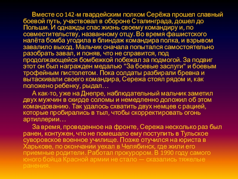 Слайд 9Вместе со 142-м гвардейским полком Серёжа прошел славный боевой путь, участвовал
