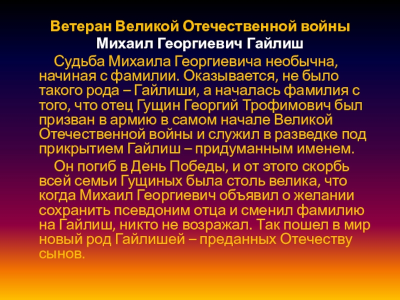 Он погиб в День Победы, и от этого скорбь всей семьи Гущиных была столь велика, что когда Михаил Георгиевич объявил о желании сохранить псевдоним отца и сменил фамилию на Гайлиш, никто не возражал. Так пошел в мир новый род Гайлишей – преданных Отечеству сынов.