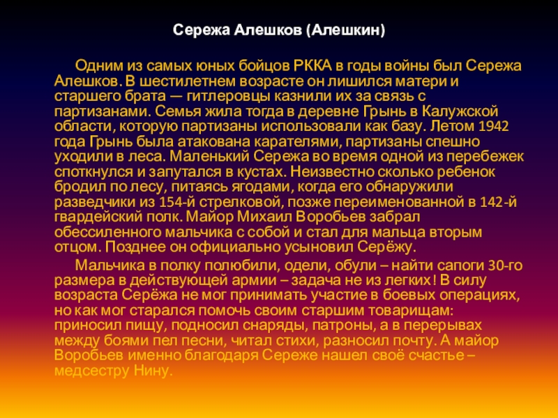 был Сережа Алешков. В шестилетнем возрасте он лишился матери и старшего брата — гитлеровцы казнили их за связь с партизанами. Семья жила тогда в деревне Грынь в Калужской области, которую партизаны использовали как базу. Летом 1942 года Грынь была атакована карателями, партизаны спешно уходили в леса. Маленький Сережа во время одной из перебежек споткнулся и запутался в кустах. Неизвестно сколько ребенок бродил по лесу, питаясь ягодами, когда его обнаружили разведчики из 154-й стрелковой, позже переименованной в 142-й гвардейский полк. Майор Михаил Воробьев забрал обессиленного мальчика с собой и стал для мальца вторым отцом. Позднее он официально усыновил Серёжу.