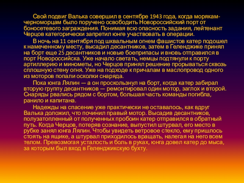 Слайд 15Свой подвиг Валька совершил в сентябре 1943 года, когда морякам-черноморцам было