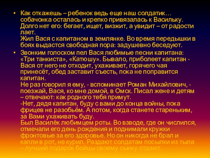 Был Василёк любимцем роты. Во взводе, где он числился, отмечали его день рождения и поднимали кружки фронтовые за его здоровье. Но он никогда не брал и капли в рот, не курил. Раздают солдатам посылки из тыла – лучший подарок бойцы своему сынку отдают.