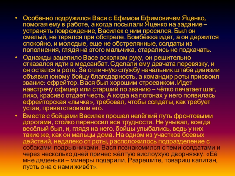 Вместе с бойцами Василек прошел нелёгкий путь фронтовыми дорогами, стойко переносил все трудности. Не унывал, всегда весёлый был, и, глядя на него, бойцы улыбались, ведь у них такие же, как он мальцы дома. На одном из участков боевых действий, недалеко от роты, расположилось подразделение с собаками-подрывниками. Вася познакомился с теми солдатами и через несколько дней принес жёлтую вислоухую дворняжку. «Её мне дяденьки – минеры подарили. Разрешите, товарищ капитан, пусть она с нами живёт».