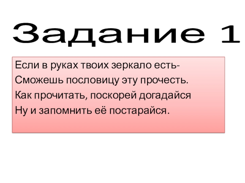 Задание 1. Если в руках твоих зеркало есть-Сможешь пословицу эту прочесть.Как прочитать, поскорей догадайсяНу и запомнить её