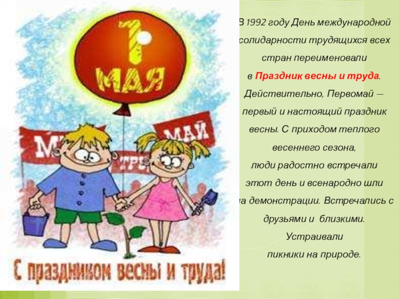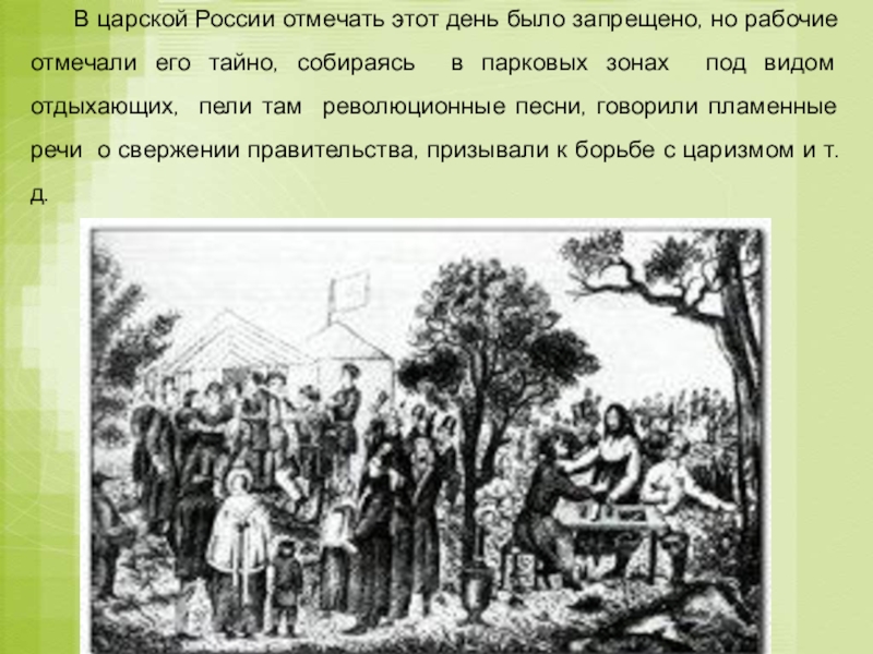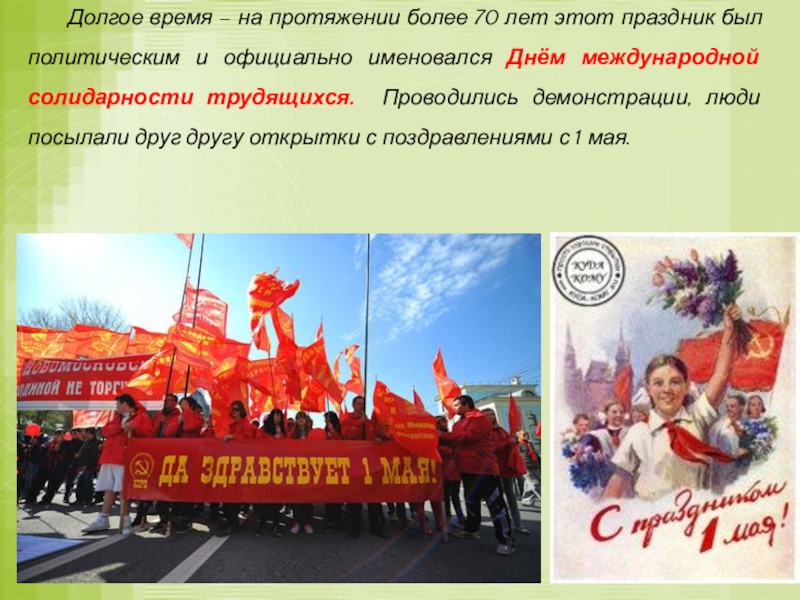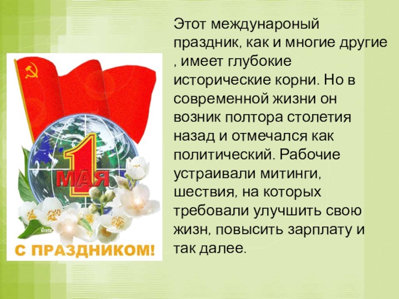 корни. Но в современной жизни он возник полтора столетия назад и отмечался как политический. Рабочие устраивали митинги, шествия, на которых требовали улучшить свою жизн, повысить зарплату и так далее.