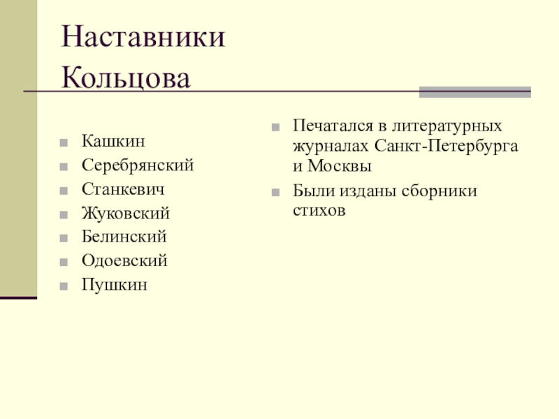 НаставникиКольцоваКашкинСеребрянскийСтанкевичЖуковскийБелинскийОдоевскийПушкинПечатался в литературных журналах Санкт-Петербурга и МосквыБыли изданы сборники стихов
