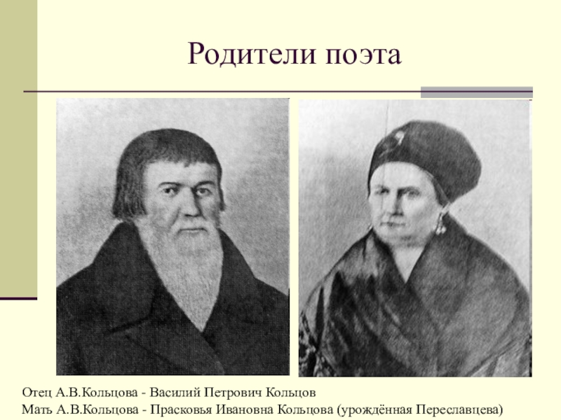 Родители поэтаОтец А.В.Кольцова - Василий Петрович Кольцов	Мать А.В.Кольцова - Прасковья Ивановна Кольцова (урождённая Переславцева)