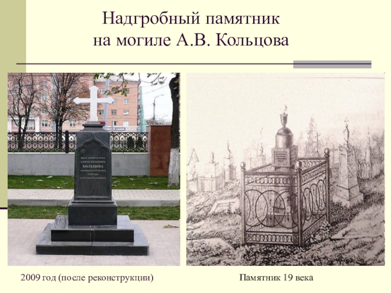 Надгробный памятник на могиле А.В. Кольцова Памятник 19 века2009 год (после реконструкции)