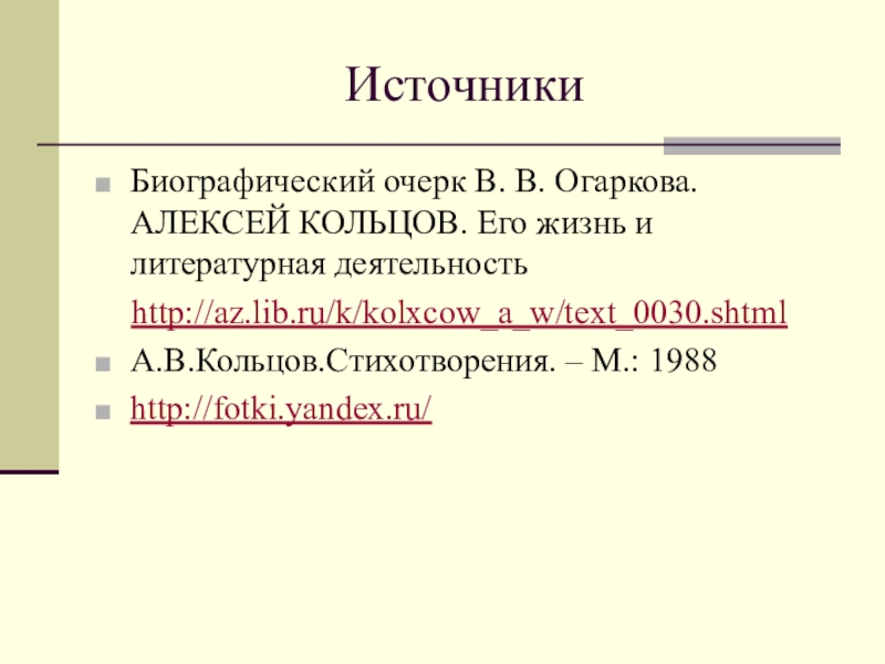 ИсточникиБиографический очерк В. В. Огаркова. АЛЕКСЕЙ КОЛЬЦОВ. Его жизнь и литературная деятельность  http://az.lib.ru/k/kolxcow_a_w/text_0030.shtmlА.В.Кольцов.Стихотворения. – М.: 1988http://fotki.yandex.ru/