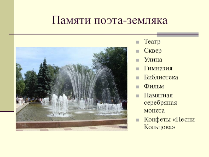 Памяти поэта-землякаТеатрСкверУлицаГимназияБиблиотекаФильм Памятная серебряная монетаКонфеты «Песни Кольцова»