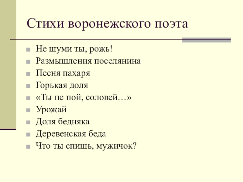 Стихи воронежского поэтаНе шуми ты, рожь!Размышления поселянинаПесня пахаряГорькая доля«Ты не пой, соловей…»УрожайДоля беднякаДеревенская бедаЧто ты спишь, мужичок?