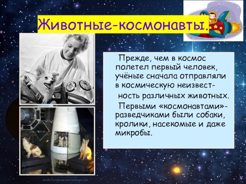 Животные-космонавты.	Прежде, чем в космос полетел первый человек, учёные сначала отправляли в космическую неизвест-	ность различных животных.	Первыми «космонавтами»-разведчиками были