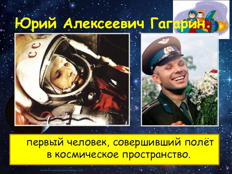 Юрий Алексеевич Гагарин - 	первый человек, совершивший полёт в космическое пространство.