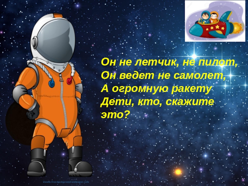Он не летчик, не пилот,Он ведет не самолет,А огромную ракетуДети, кто, скажите это?